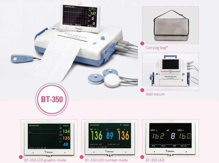 BT 350 fetal monitor has a 7-inch LCD screen and a battery life of 5 hours.