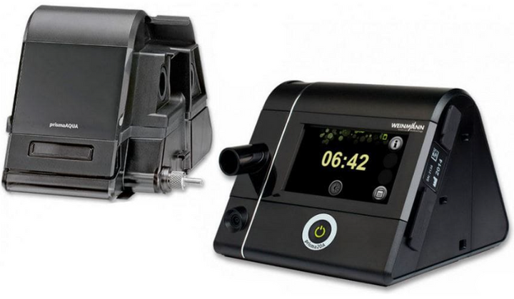 BiLevel therapy device for the treatment of patients with obstructive, mixed, or complex sleep apnea and a high and/or fluctuating pressure requirement, poor CPAP compliance, central apneas, sleep-related or position-dependent hypoventilation (e.g., OHS), respiratory insufficiency, coprevalent respiratory insufficiency (e.g., COPD/ overlap). The device has different pressure levels during inspiration and expiration and a backup frequency for the treatment of central events.