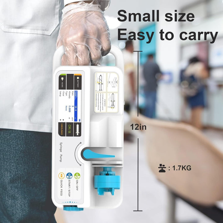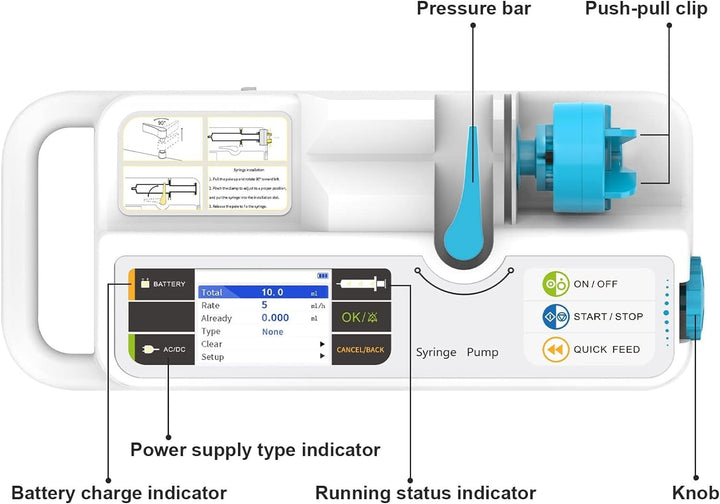 - Alarm functions: occlusion, empty, near empty, low battery, infusion over, syringe loose, etc